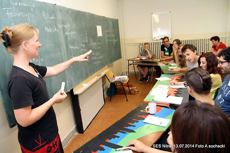 Dum NASK, Birke Dockhorn kaj la normalaj uloj priparolas basbalon, la vivon en Usono, instruadon, kaj tiel plu. Foto: Nitra: Birke Dockhorn instruas, el la ''Ondo pli...
