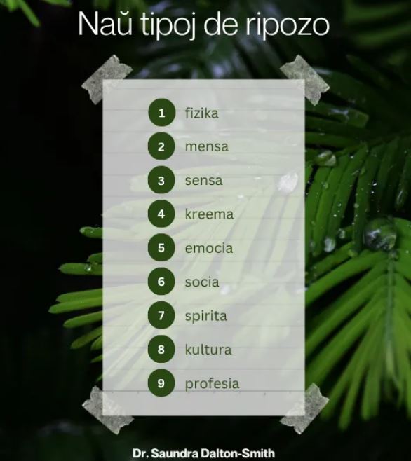 Ni uzas por nia babilado la ideojn de Dr. Saundra Dalton-Smith, kiu verkis pri la naŭ tipoj de ripozo kiujn ni bezonas. Kune ni babilados pri tiu kiuj tipoj gravas pli por ni kaj ni rakontos al vi niajn somerajn planojn.
